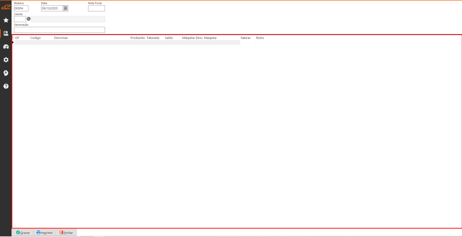 - Esta tabela exibe as Ordens de Fabricação (OFs) vinculadas ao cliente consultado e permite definir tanto a quantidade a ser faturada quanto o número de rolos.