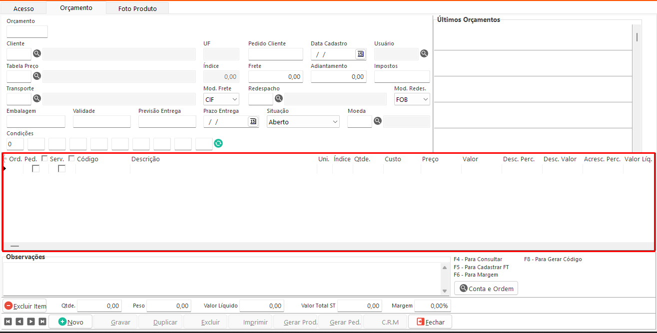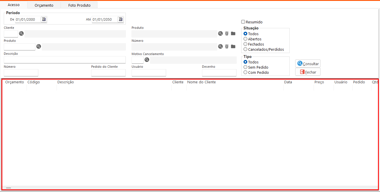 • Acesso: Apresenta os orçamentos cadastrados. Ao clicar duas vezes em um registro, as informações são transferidas para a aba Orçamento.