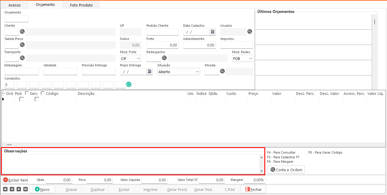 • Mod. Frete: Informa o responsável pelo transporte do orçamento.