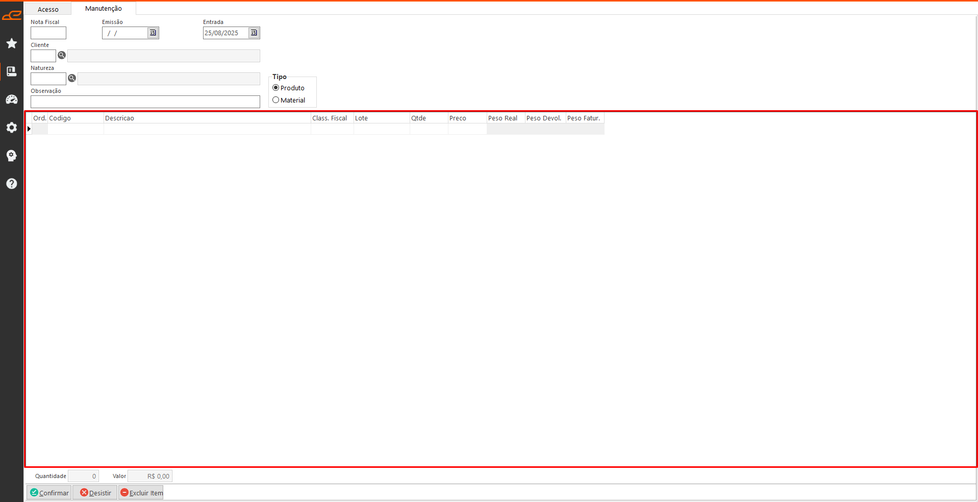 - Excluir: Permite excluir a nota fiscal de entrada.