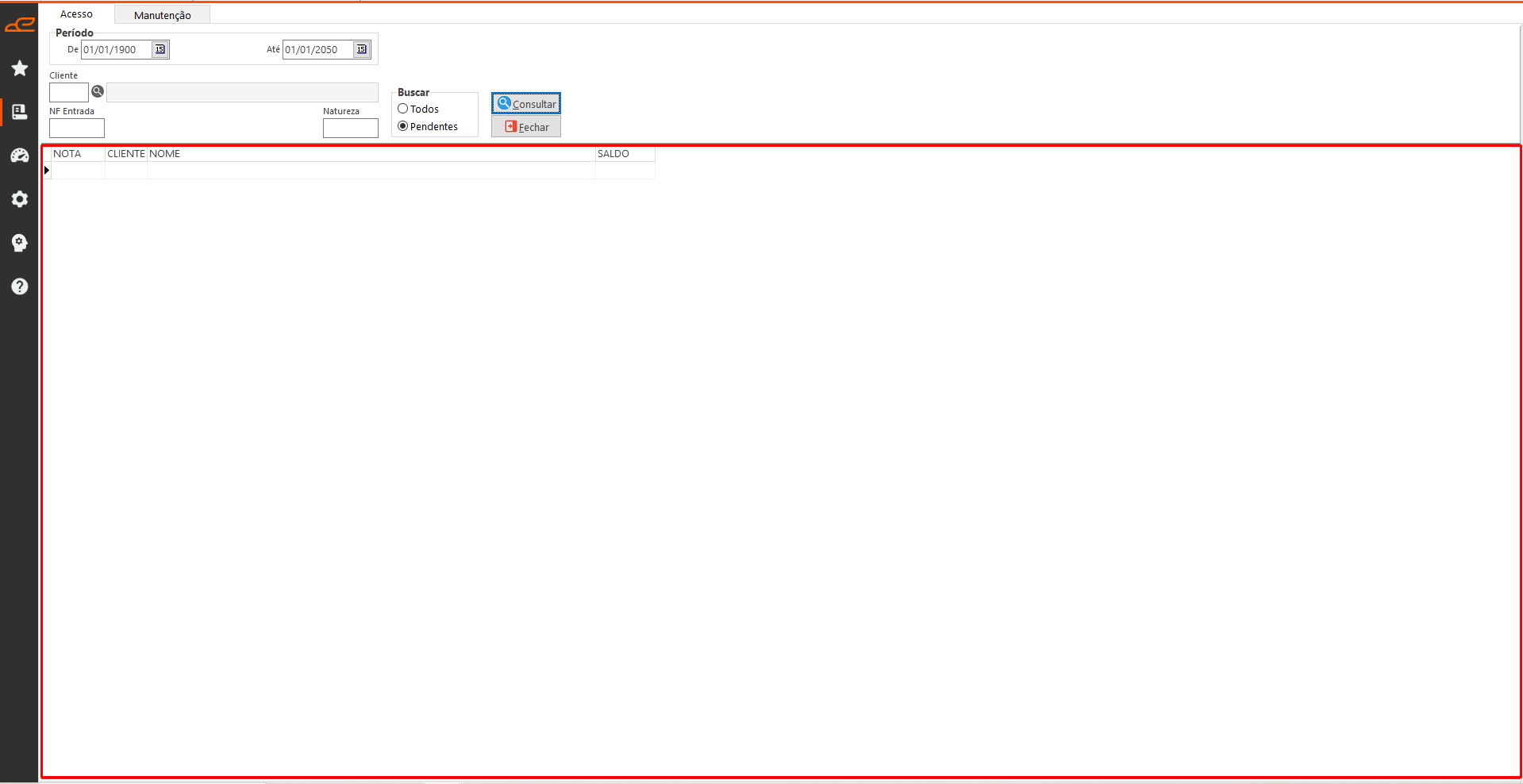 - Buscar: Permite localizar notas fiscais já devolvidas (pendentes) ou todas.