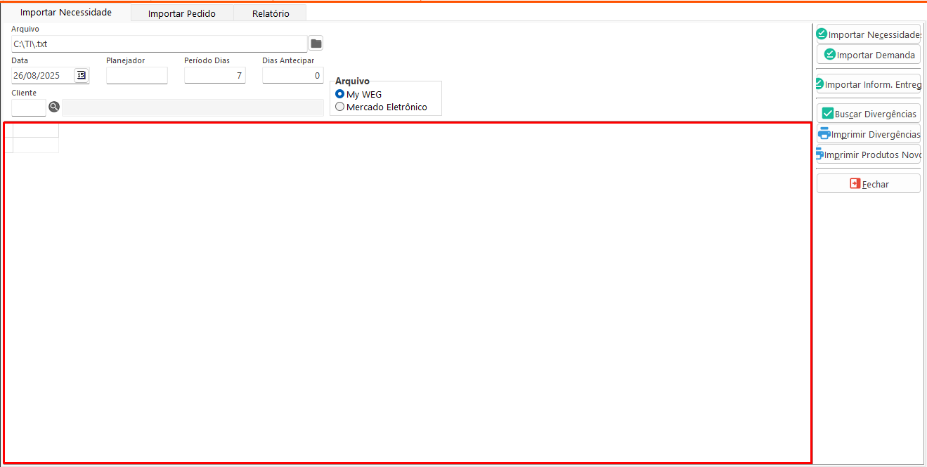 Arquivo: Abre o explorador de arquivos para localizar o caminho do arquivo.- Importar Necessidade: Importa o arquivo de necessidade no sistema.