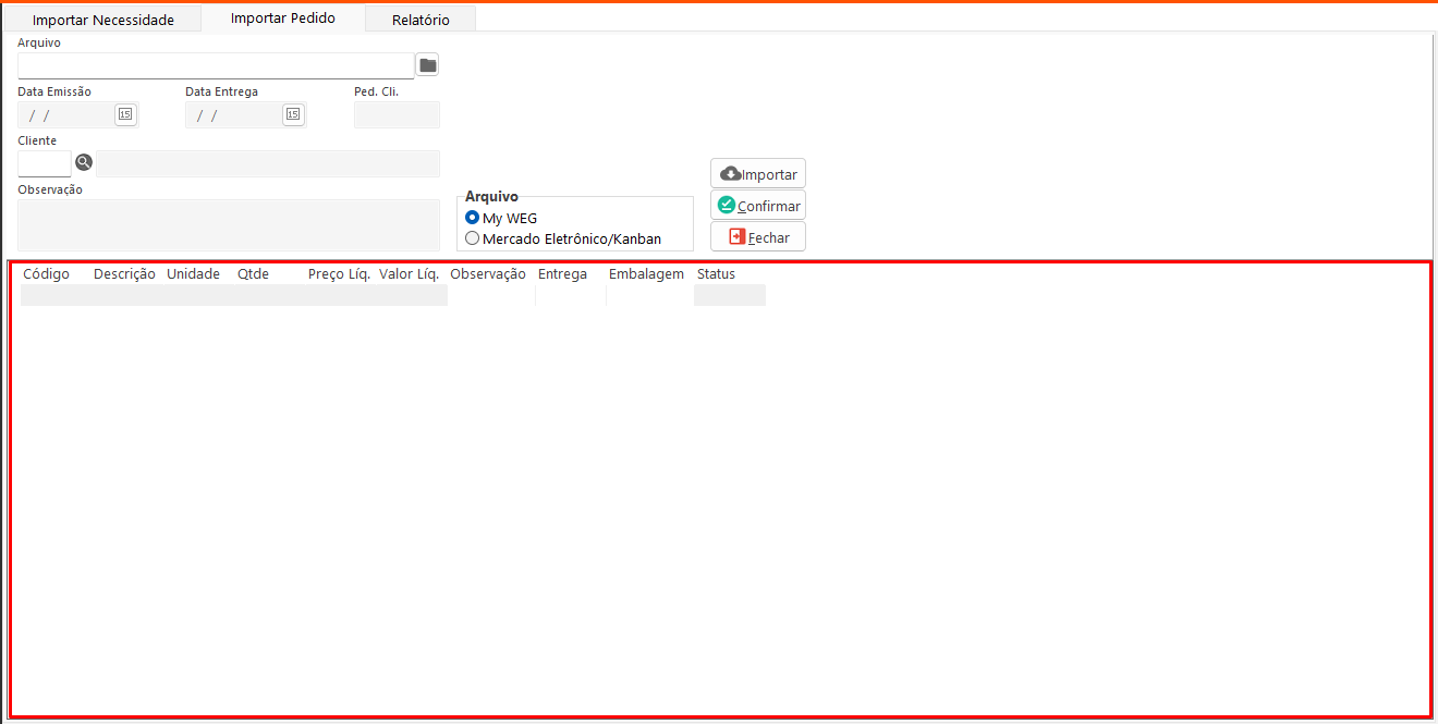 - Confirmar: Inclui o pedido no sistema conforme as informações importadas.