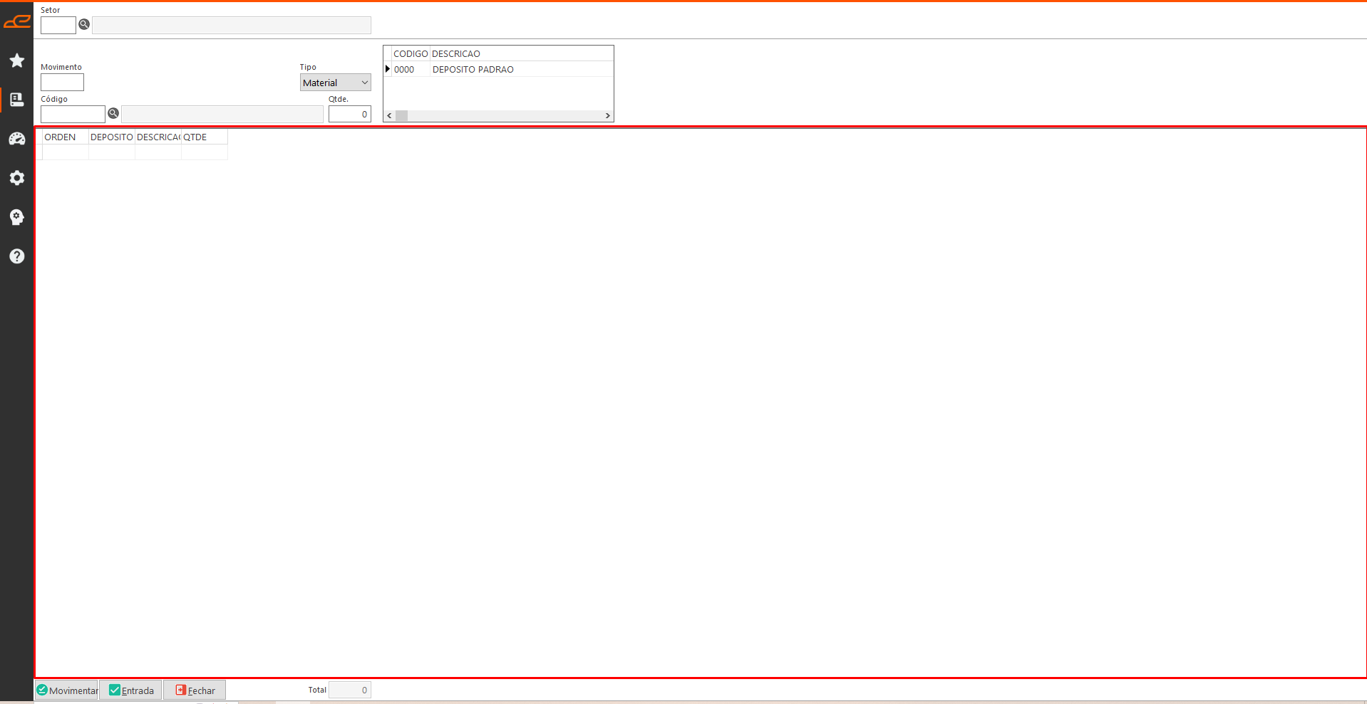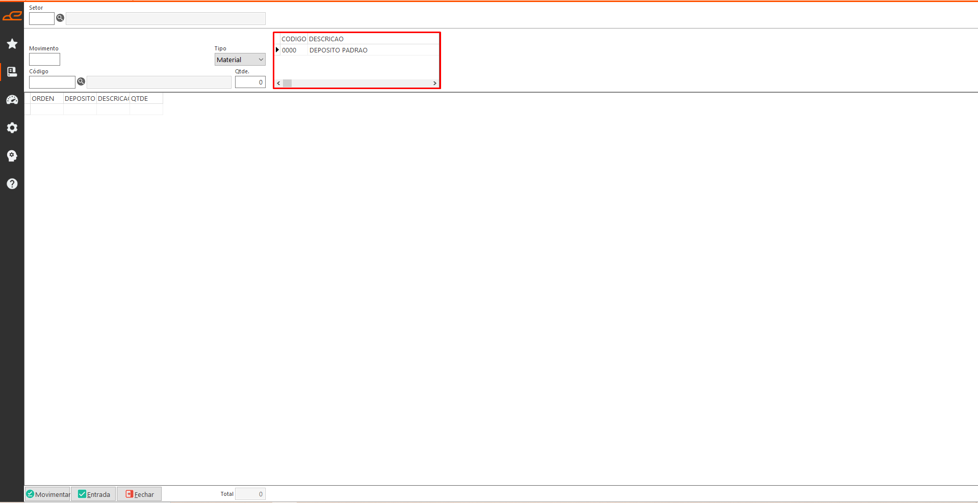 • Movimentar: Permite movimentar os itens do depósito de origem (Filtro: Setor) para o depósito de destino (Escolhido na tabela Depósito).