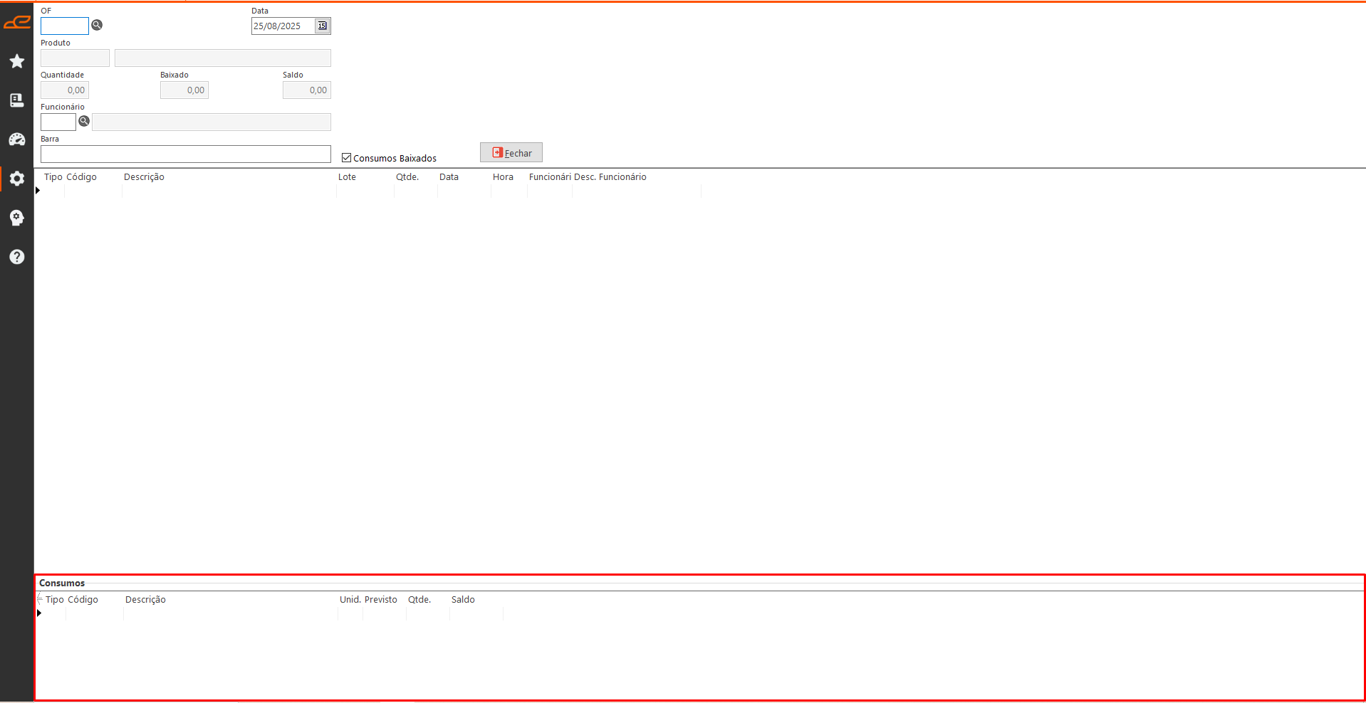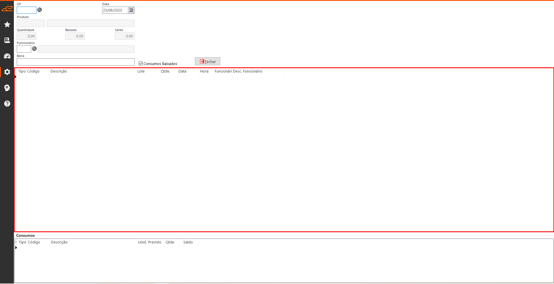 - Funcionário: Referente ao funcionário que esta efetuando a baixa dos consumos da ordem de produção.