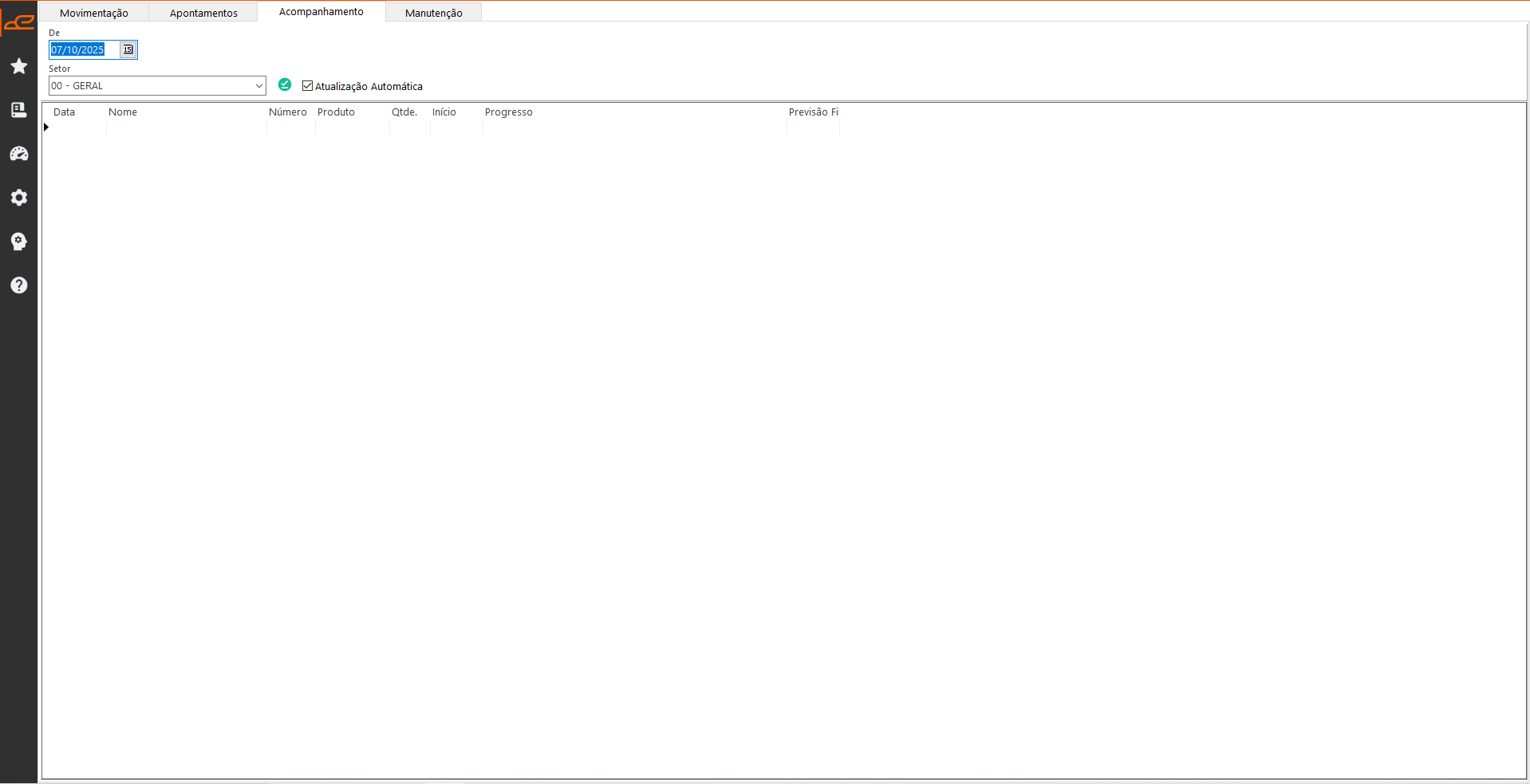 • Atualização Automática: Permite atualizar automaticamente a consulta das movimentações de apontamentos de OP, mantendo o acompanhamento sempre em tempo real.