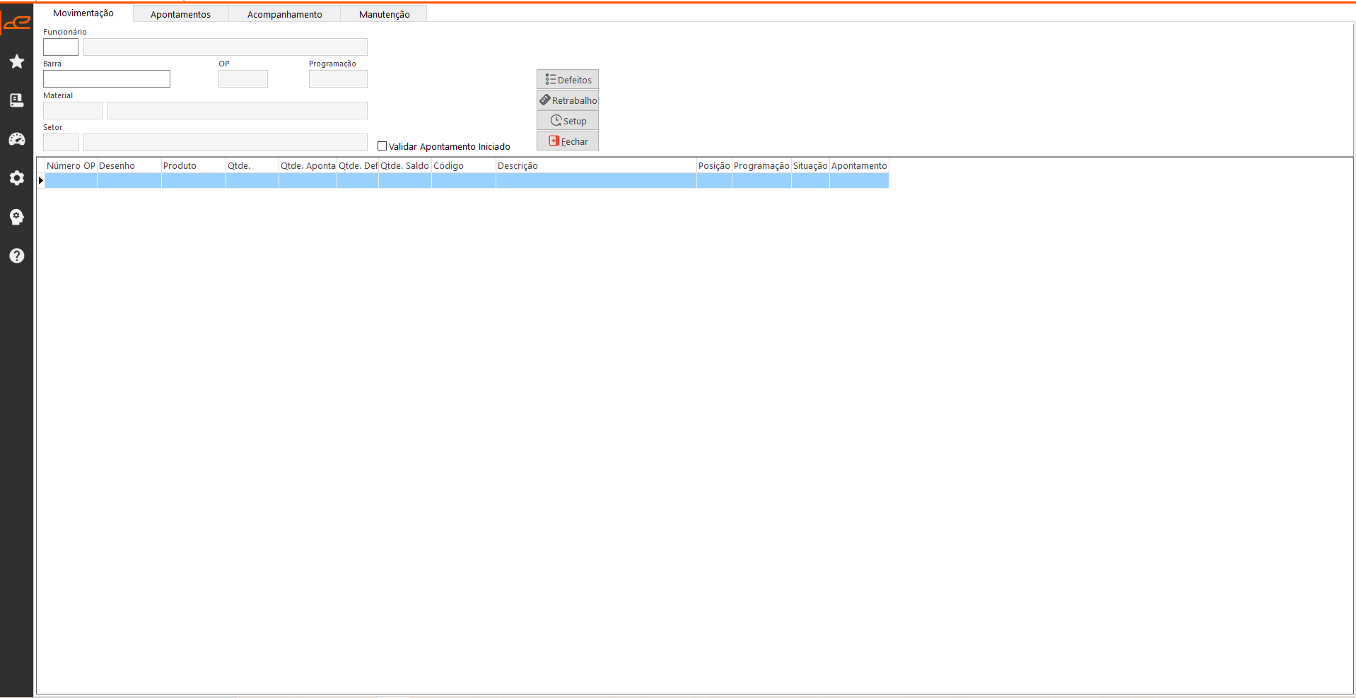 Esta aba permite iniciar o apontamento da OP a partir da leitura do código de barras.
