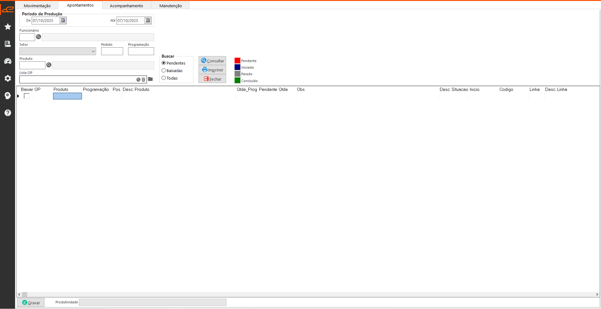 • Situação: Define a situação do apontamento de OP.