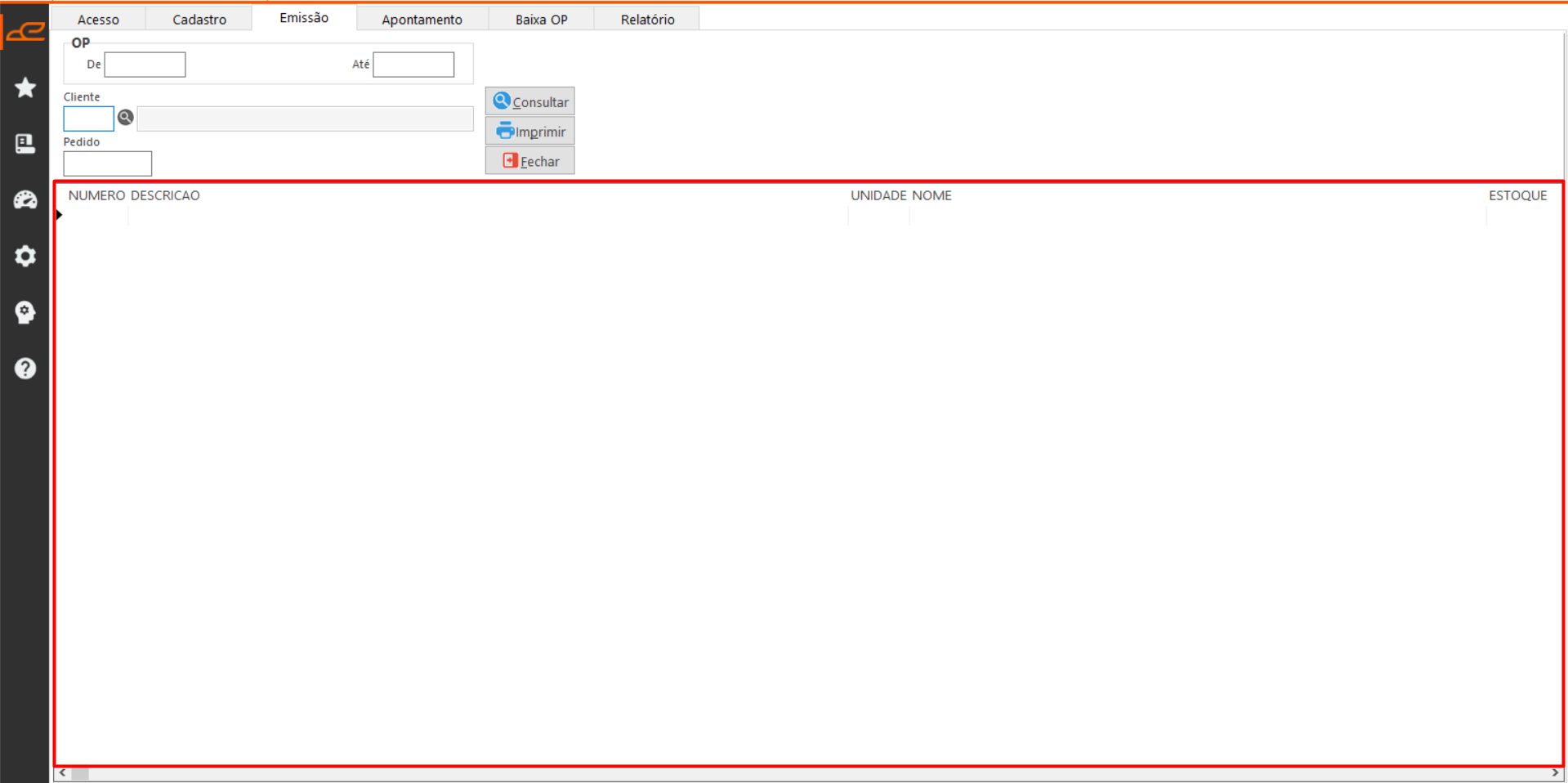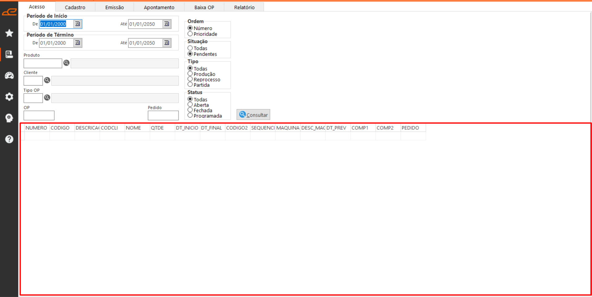 - Consulta: Permite consultar as OPs com base nos filtros e opções definidos na tela.