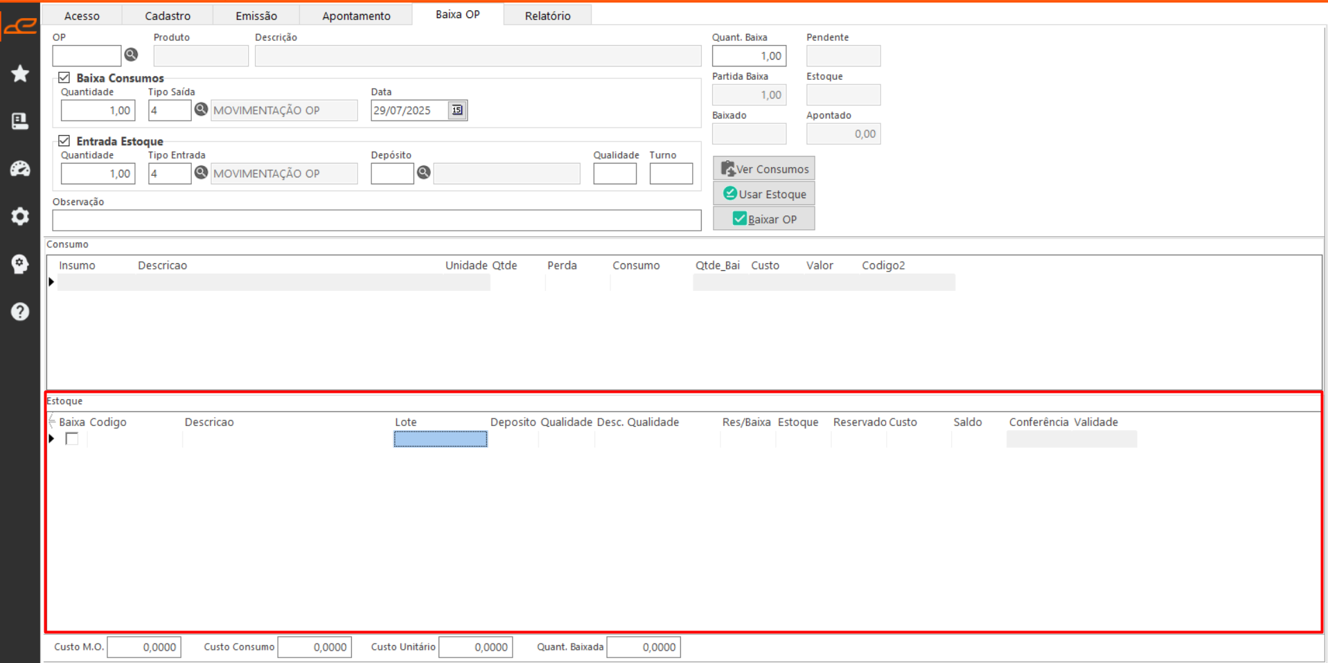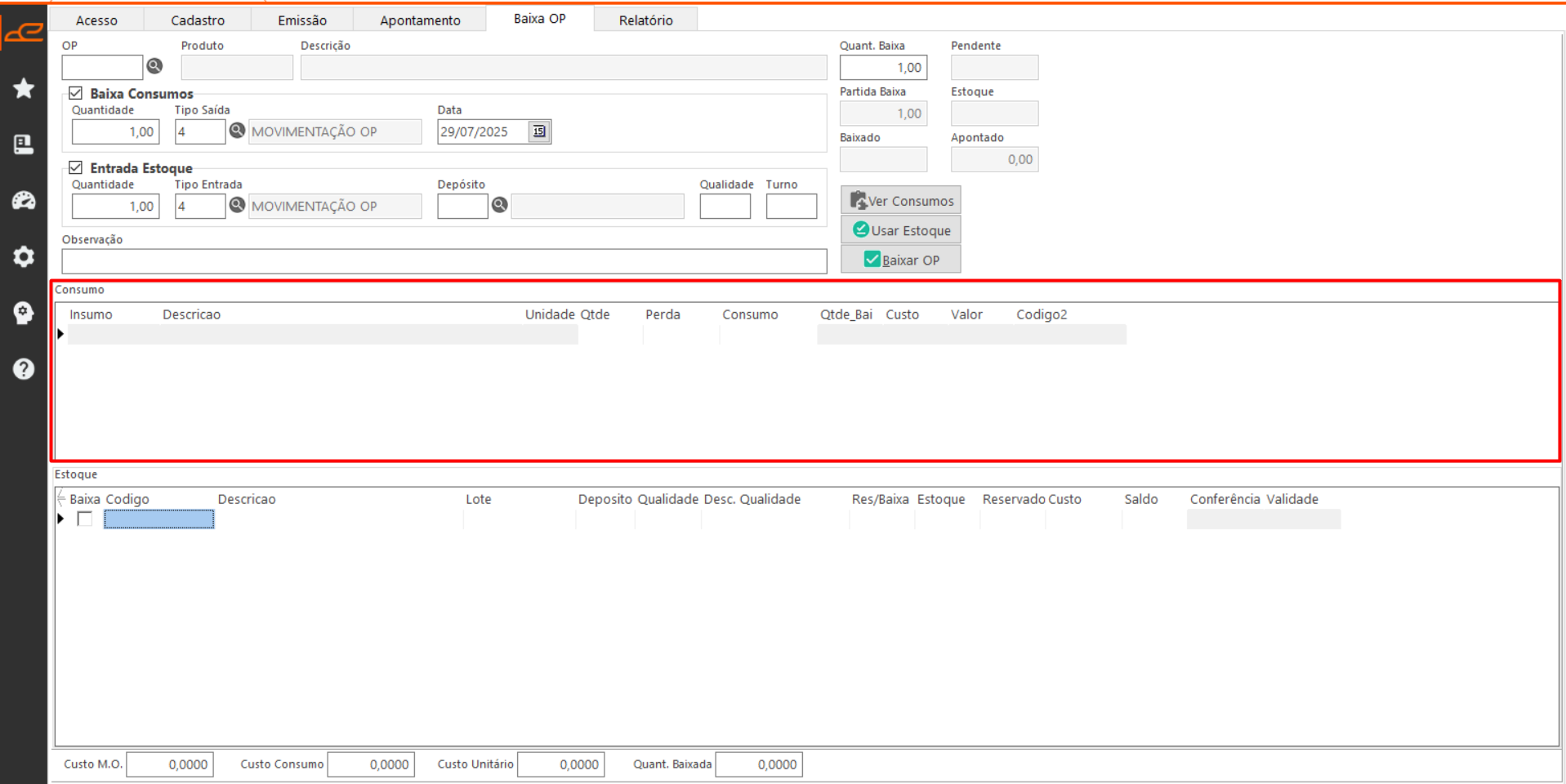 - Usar Estoque: Seleciona um registro da tabela estoque para uso na baixa dos consumos da OP.