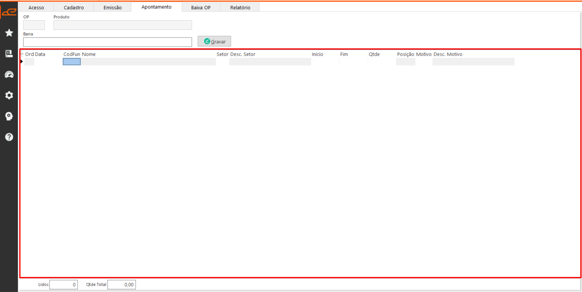- Barra: Permite fazer a leitura do código de barras do produto para apontamento.