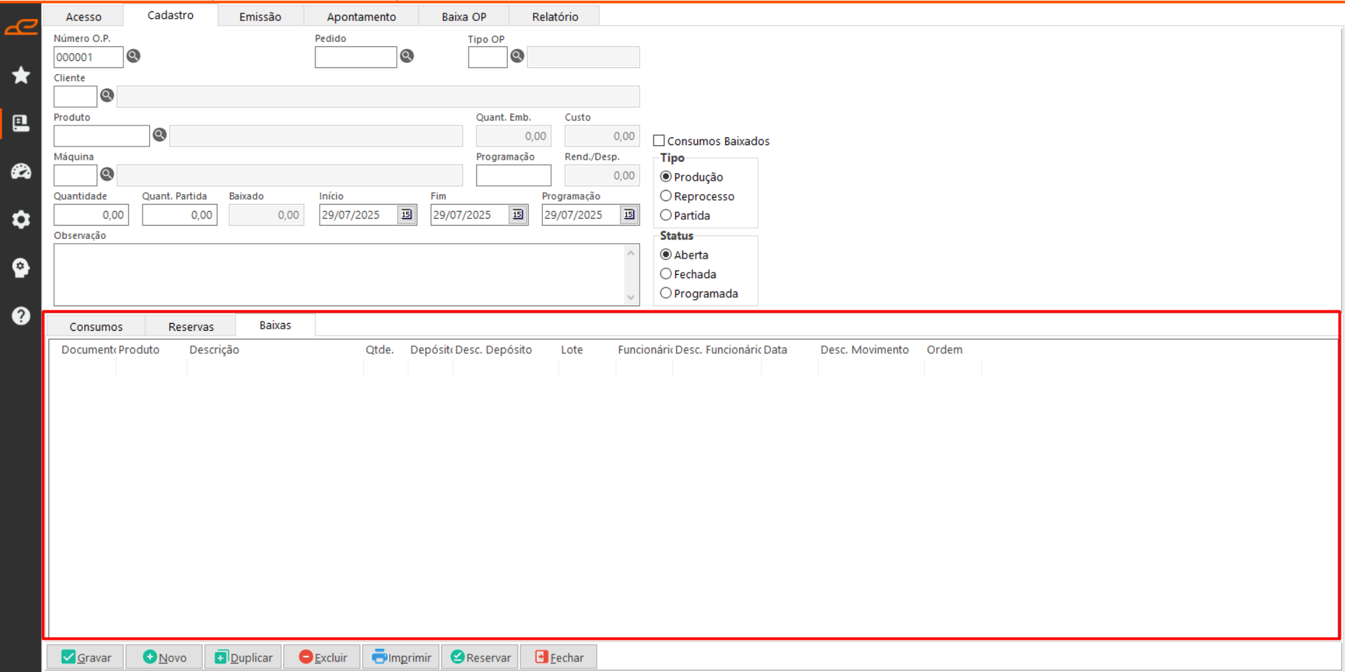 - Baixar OP: Permite fazer a baixa da OP.
