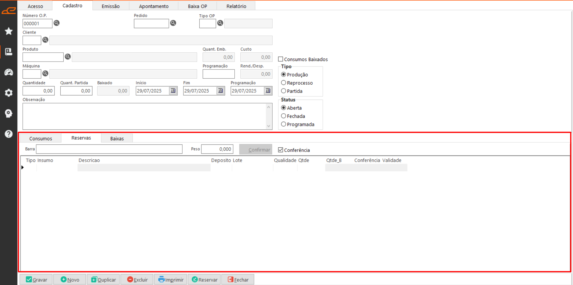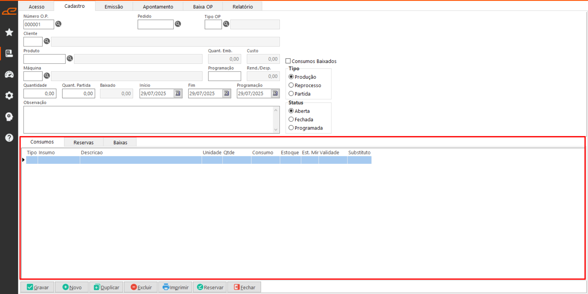 Esta aba permite cadastrar Ordens de Produção, realizar reservas de consumo e estornar baixas já efetuadas.