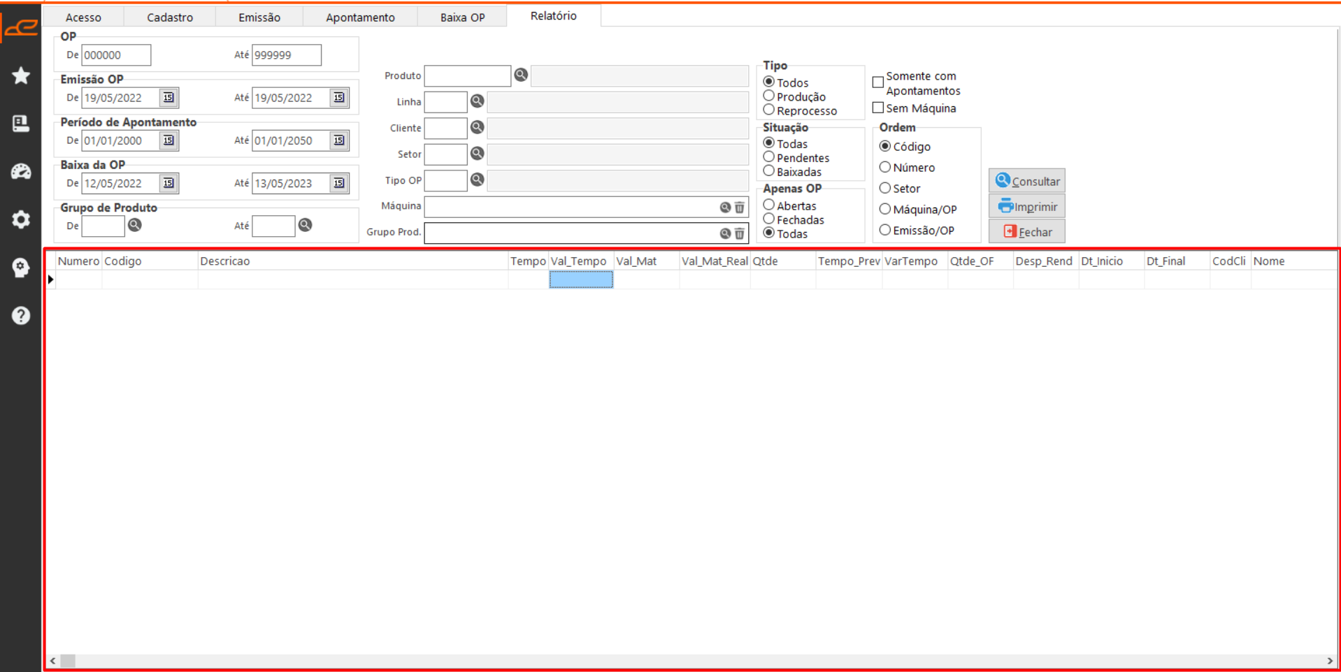 Esta aba permite realizar consultas personalizadas das OPs cadastradas para geração de relatórios.