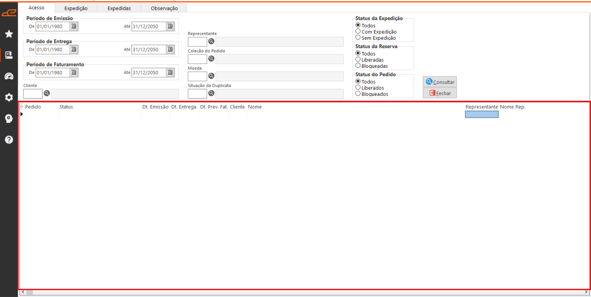 Esta aba é destinada à consulta dos pedidos, com base nos filtros e opções disponíveis na tela, para facilitar a análise antes da expedição. Ao consultar os pedidos, é possível dar um duplo clique sobre um deles para abri-lo diretamente na aba de expedição, onde será realizado o processo de expedição.