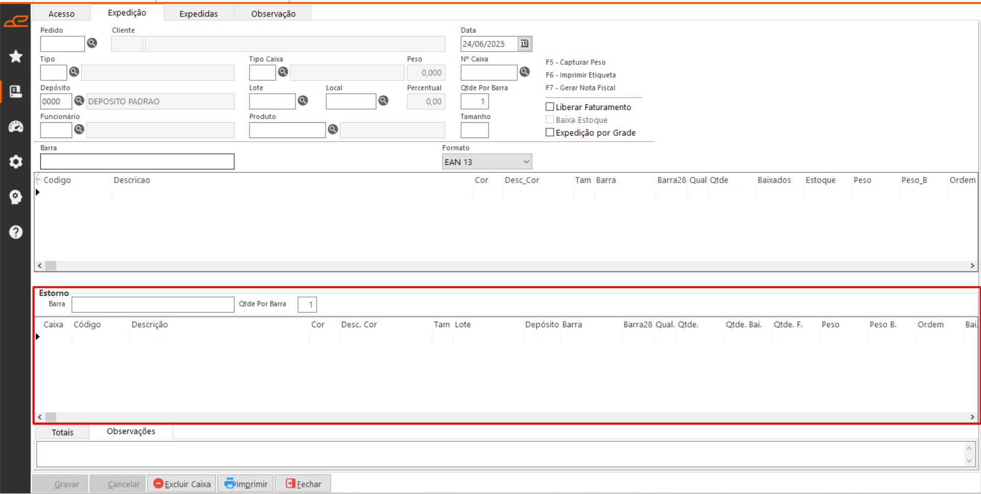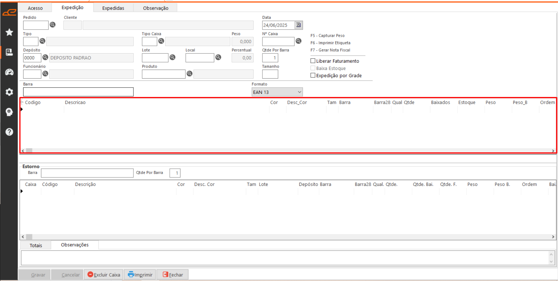 • F6 – Imprimir Etiqueta: Permite imprimir a etiqueta referente a expedição ao pressionar a tecla F6.