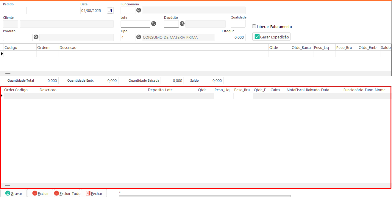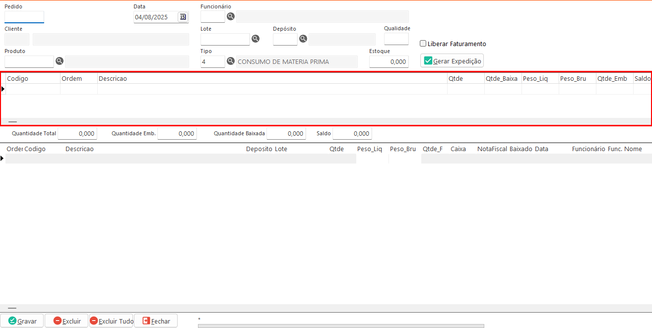 • Saldo: Apresenta a diferença entre a Quantidade Total e a Quantidade Baixada.