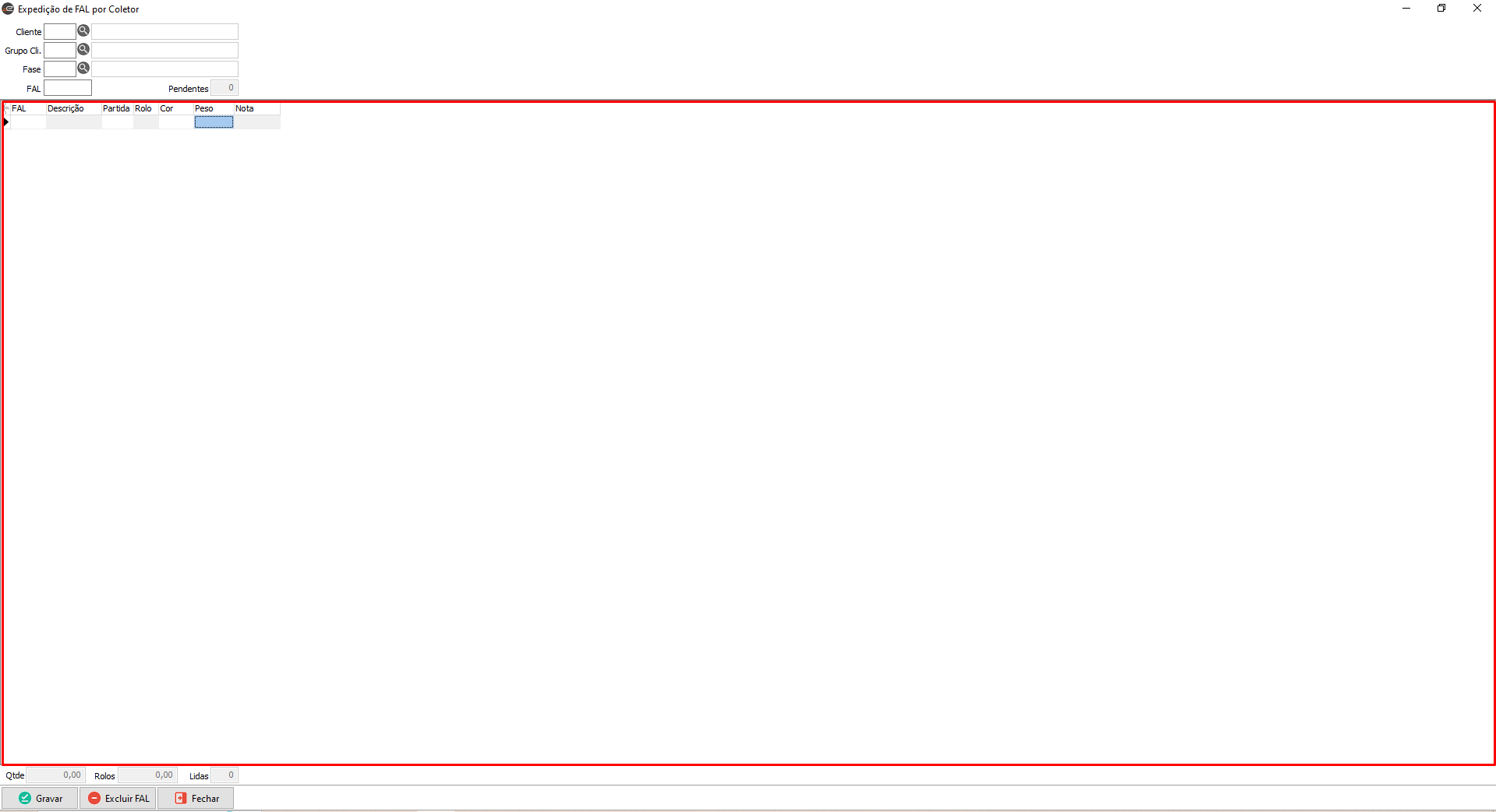 A tela “De FAL por Coletor” permite fazer a expedição das FALs (Ficha de Acompanhamento de Lote) através de um coletor.