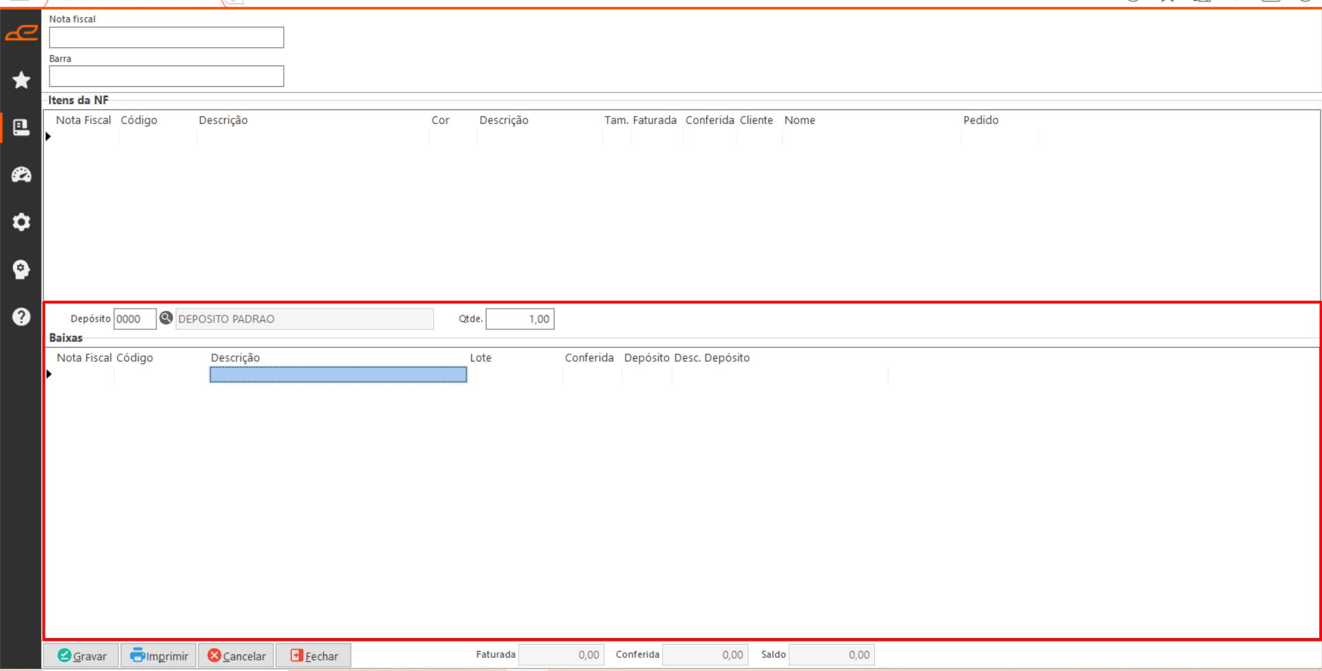 • Depósito: Permite definir o depósito que será feito a baixa dos itens conferidos.