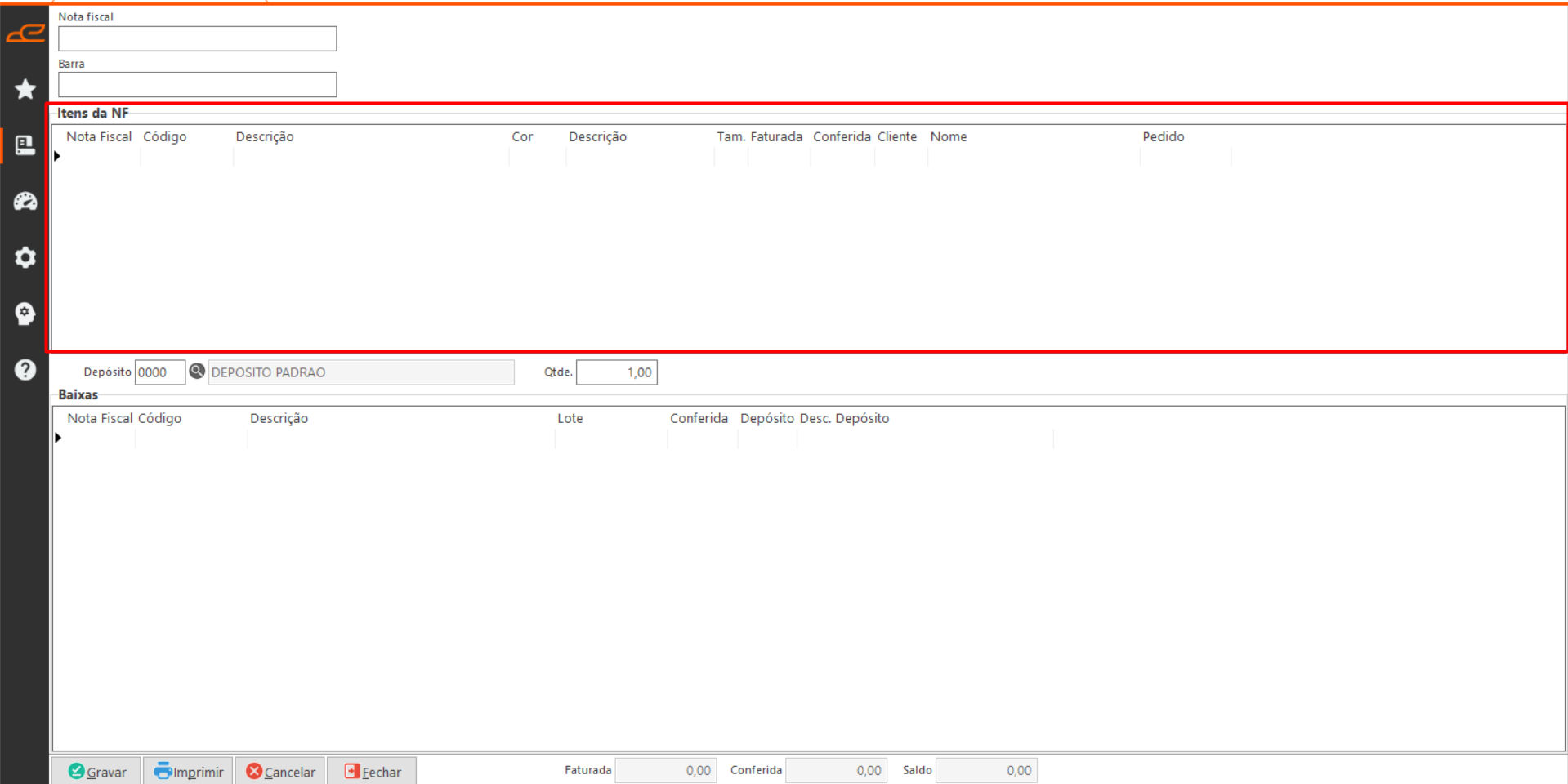 • Baixas: Esta tabela exibe os itens da nota fiscal e, ao ler o código de barras de um item por meio do filtro ‘Barra‘, atualiza a quantidade conferida no campo ‘Conferida‘.