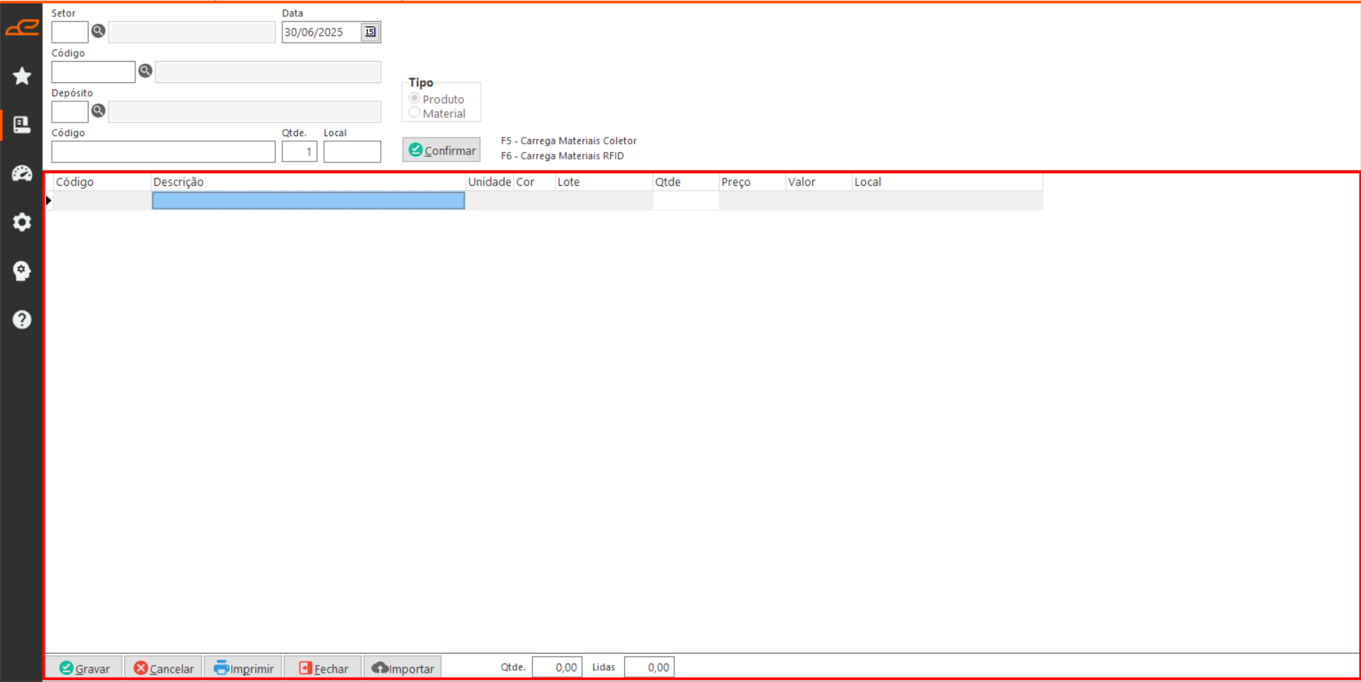 • F5 – Carregar Materiais Coletor: Importa os dados dos itens a partir de um arquivo .txt, realizando a leitura conforme as configurações definidas previamente no sistema.