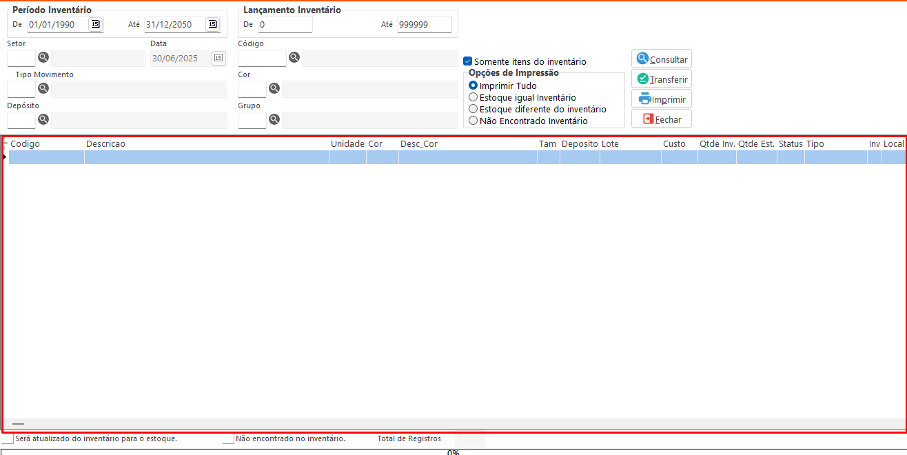• Somente Itens do Inventário: Exibe apenas os registros que estão presentes no inventário.
