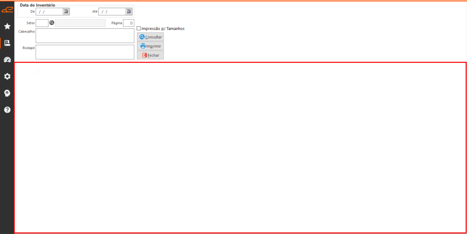A tela “De Registro de Inventário” permite consultar e imprimir os inventários gerados no sistema.