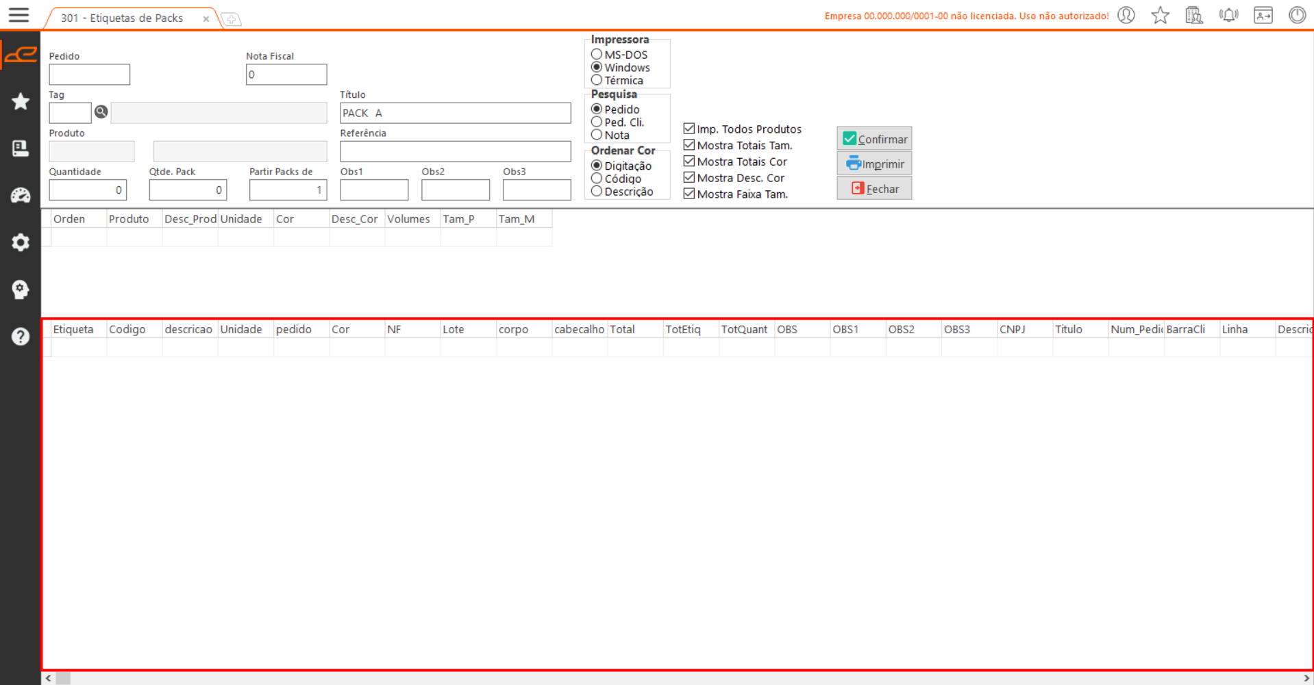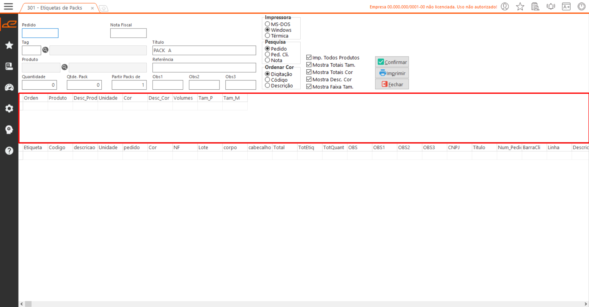 - Confirmar: Permite gerar as etiquetas com base na quantidade de packs consultada.