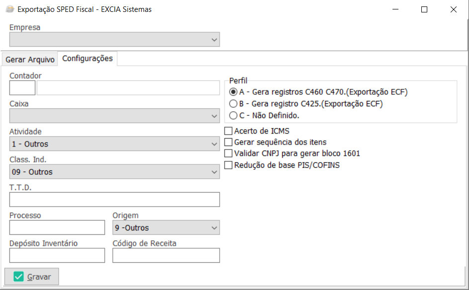 - Gravar: Permite gravar as configurações para geração do arquivo SPED Fiscal.