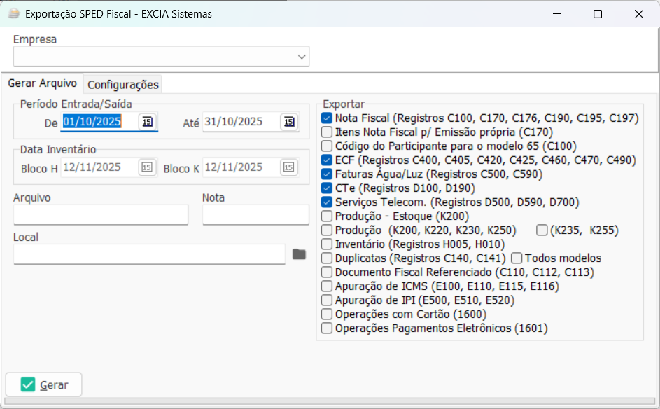 Esta aba permite selecionar os blocos que serão exportados para o arquivo SPED Fiscal, definir qual bloco de inventário será gerado, escolher a pasta onde o arquivo será salvo, além de informar o intervalo de datas para o período de entrada e saída das notas fiscais.