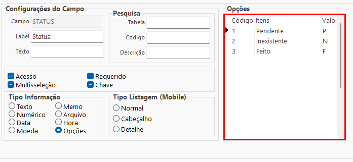 Para campos que utilizam opções, é necessário preencher a tabela Opções, informando:
