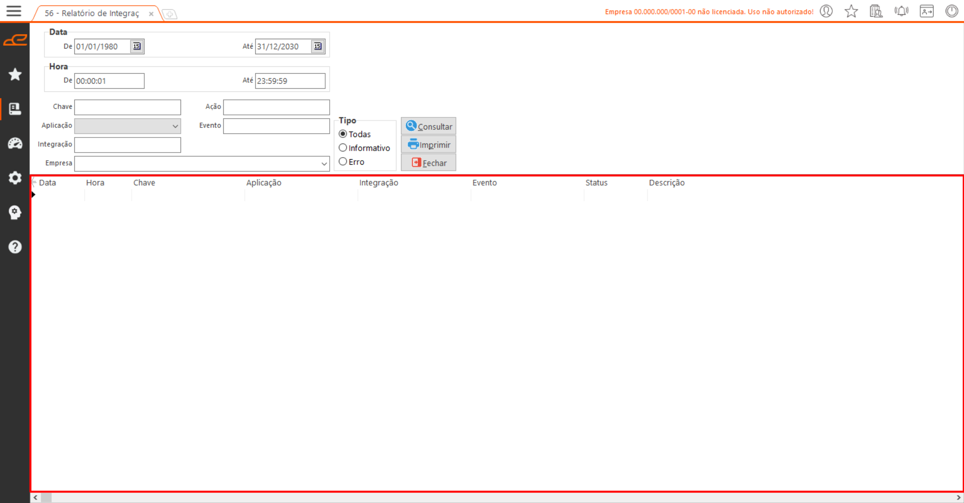 - Empresa: Permite selecionar a empresa do sistema da qual se deseja consultar o log de integração.