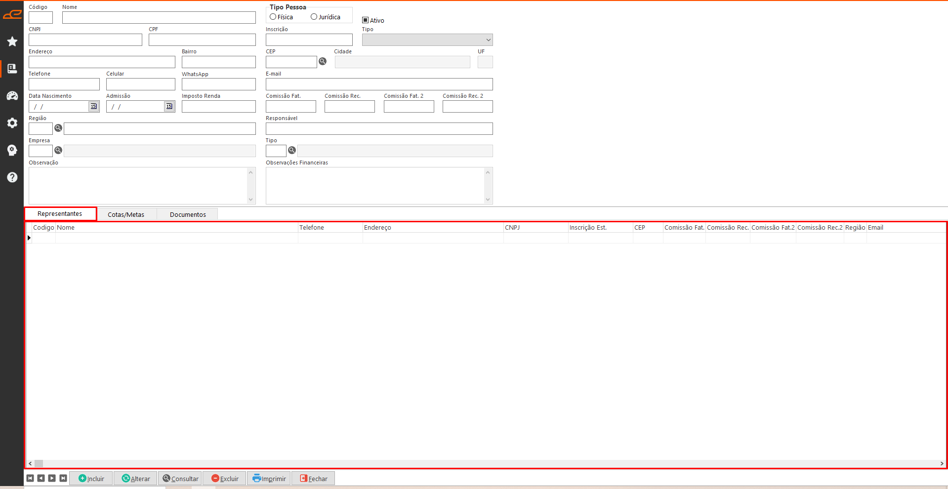 • Incluir: Permite fazer a inclusão de um novo cadastro de representante no sistema.