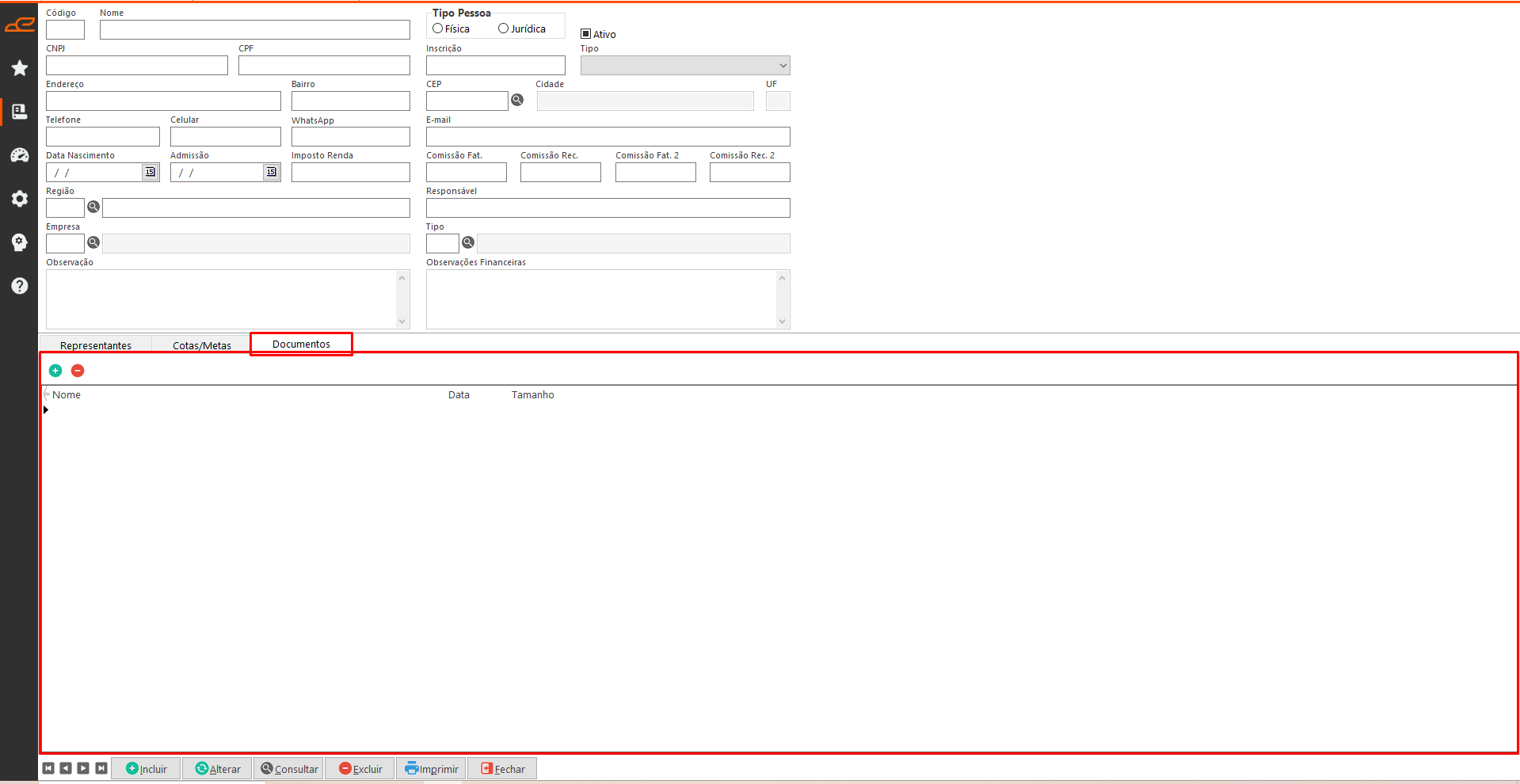 • Documentos: Permite vincular documentos ao cadastro do representante.
