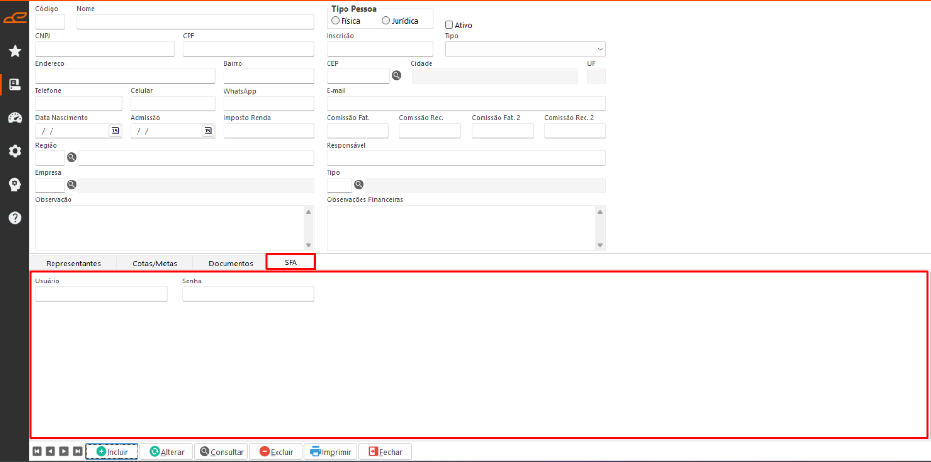 • Observações Financeiras: Referente a observação financeira do cadastro de representante.