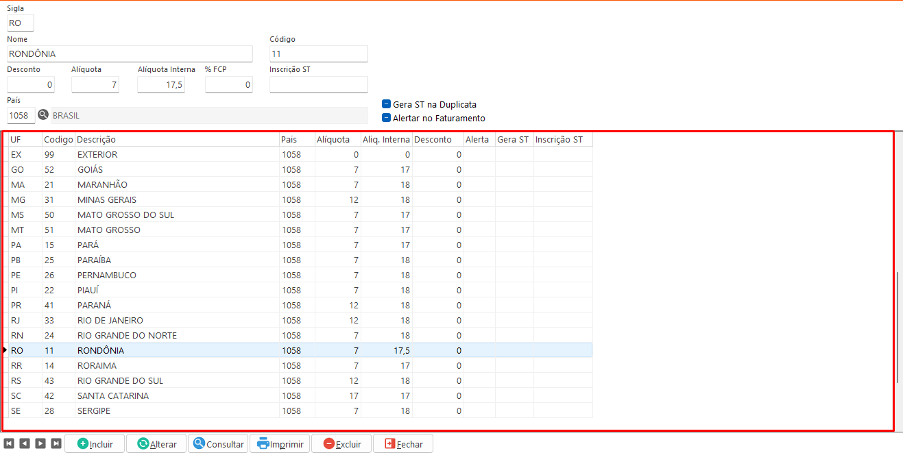 - Consultar: Abre a pesquisa para consultar um estado existente.