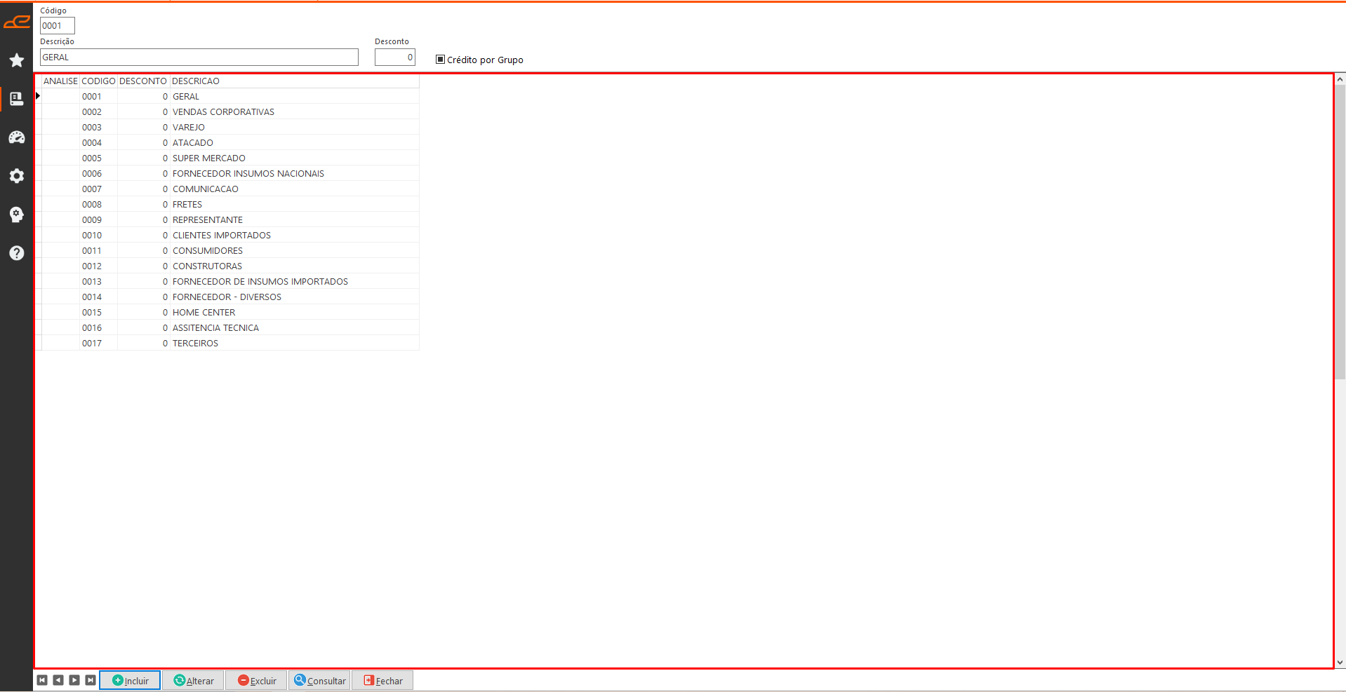 • Esta tabela exibe os grupos de parceiros cadastrados no sistema.