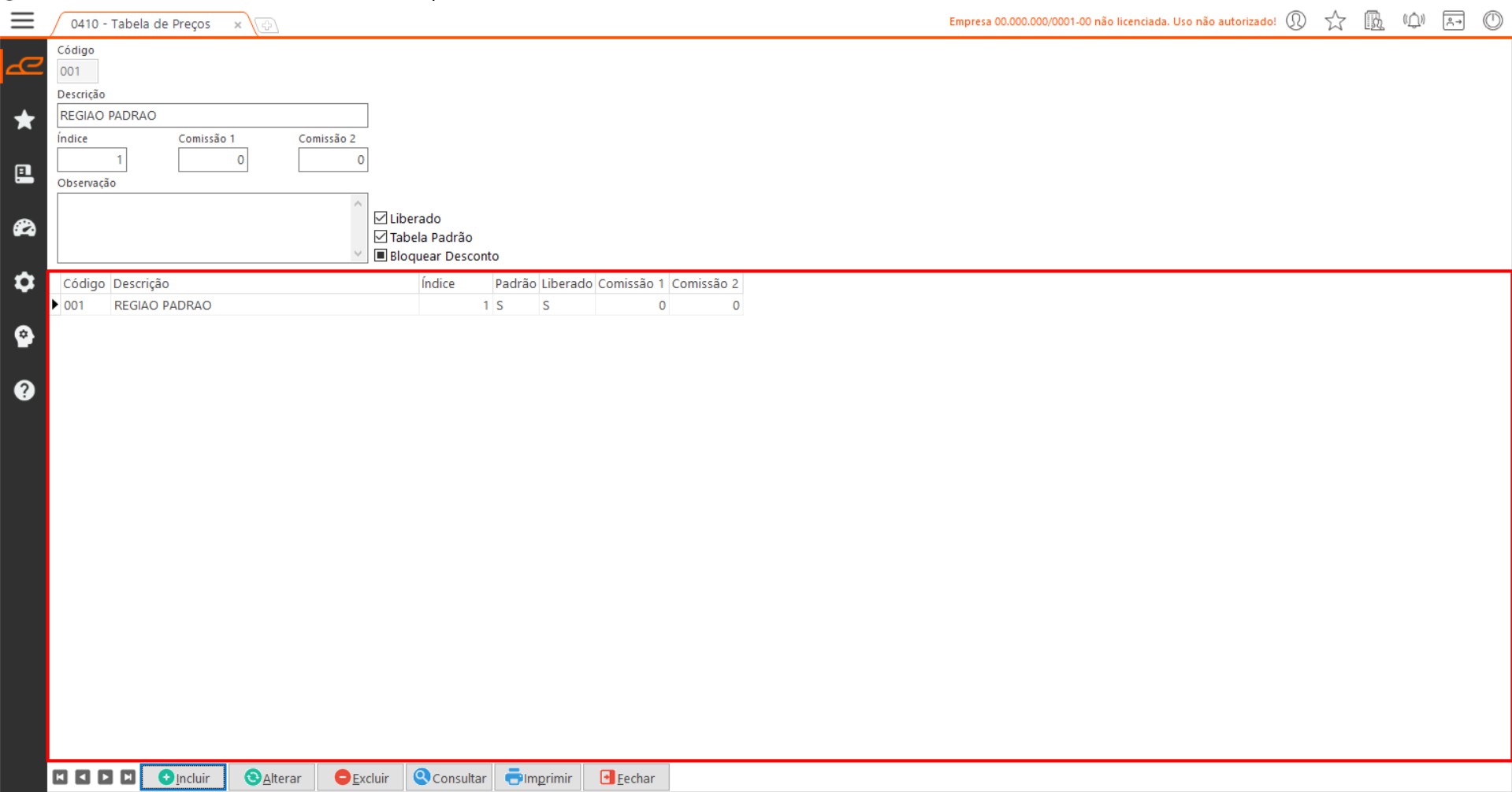 • Incluir: Permite fazer a inclusão de uma nova tabela de preços.