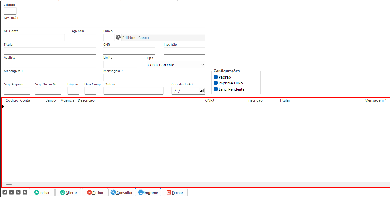 - Padrão: Indica que a conta cadastrada é a conta padrão utilizada pelo sistema.