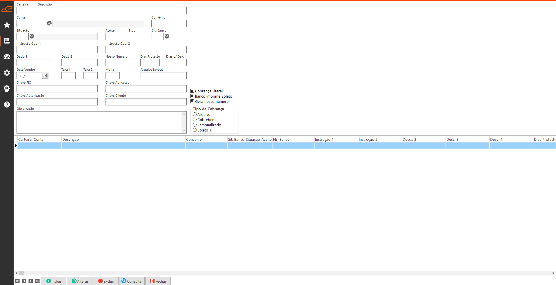 - Alterar: Permite fazer alterações no cadastro de uma carteira de cobrança.