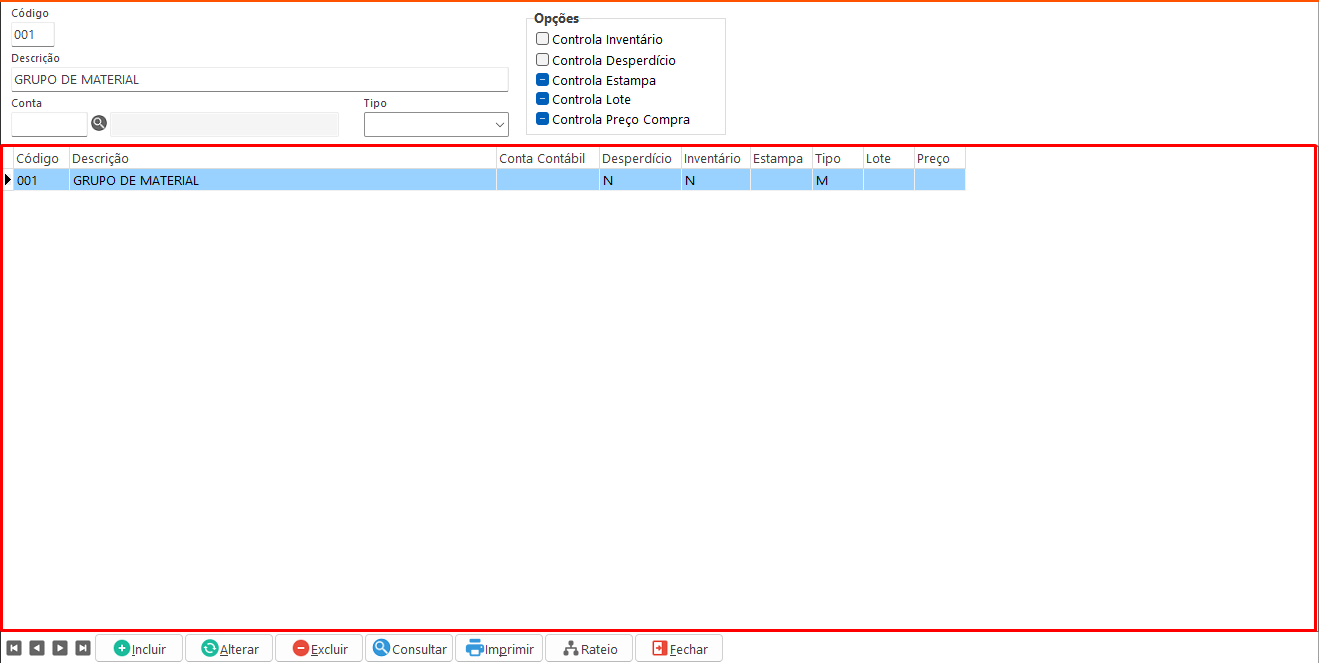 • Tipo: Informa o tipo do grupo, se para material ou serviço.