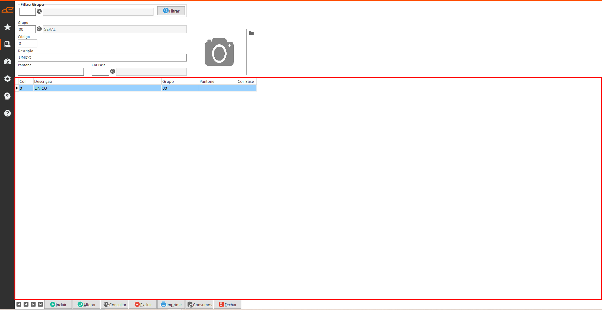 - Filtro Grupo: Permite selecionar um grupo de cores para exibir, na tabela, apenas as cores vinculadas a esse grupo.