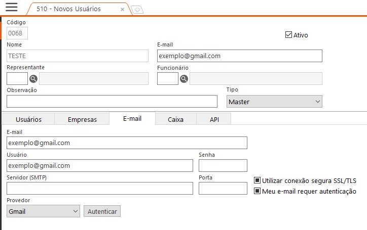 Passo 1 – Clicar no usuário e selecionar o botão “Alterar” no ERP, com isso a tela ficará em modo de edição e deve-se revisar o e-mail nos campos de e-mail e usuário, após isso selecionar o provedor “Gmail” e clicar no botão “Autenticar”: