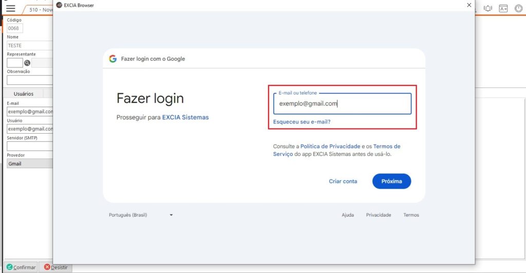 Passo 2 – Excia Browser será aberto, com isso informar o e-mail que será autenticado e após isso a senha (Nesse passo, pode ser solicitado uma autenticação adicional de dois fatores, isso pode variar de acordo com a configuração e-mail):