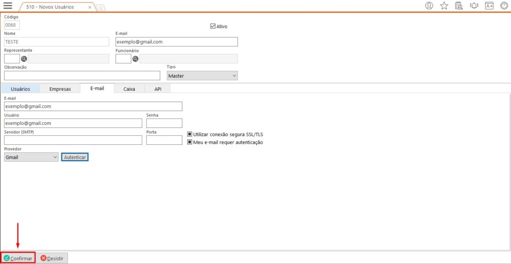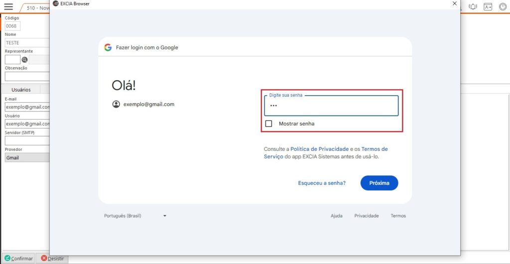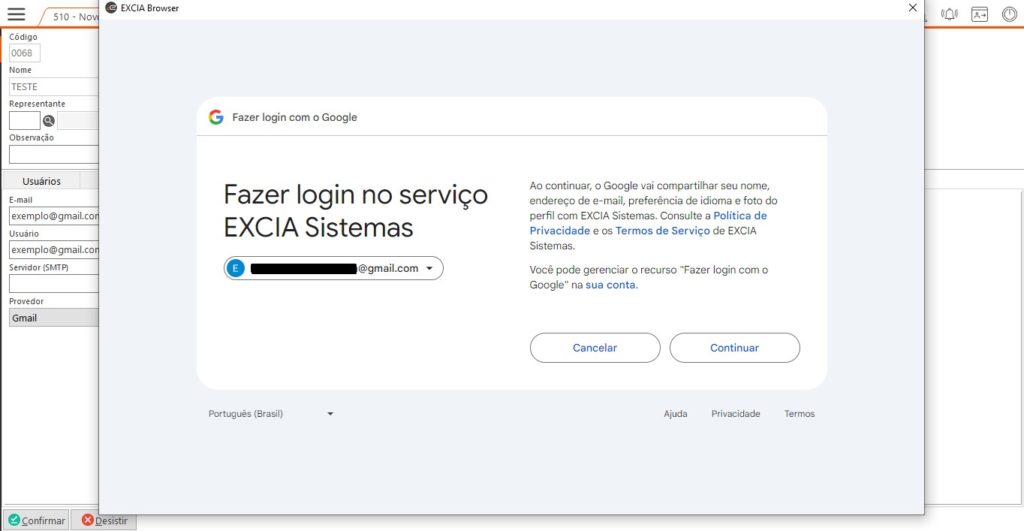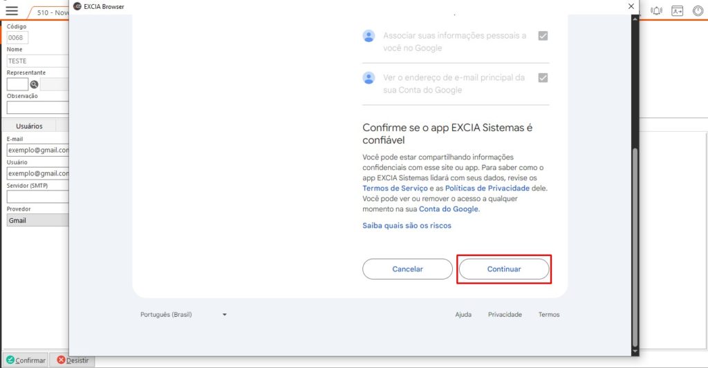 Passo 8 – Após concluir, a tela do Excia Browser será fechada e é necessário confirmar o cadastro do usuário para aplicar devidamente a autenticação dentro do ERP: