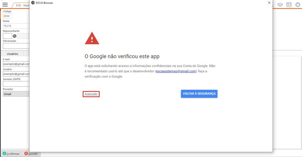 Passo 3 – No caso do Google, a funcionalidade ainda está em fase de liberação, portanto na tela abaixo, deverá clicar em “Avançado” para prosseguir com a autenticação:
