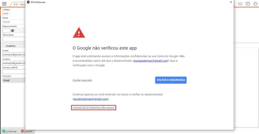 Passo 4 – Após isso clicar em “Acessar Excia Sistemas (não seguro)”: