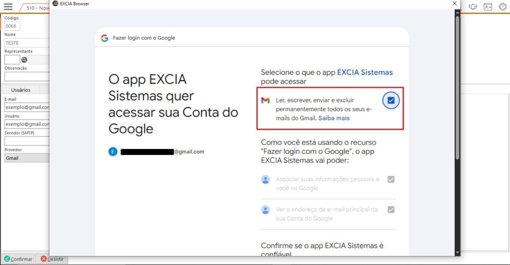 Passo 6 – Após isso será solicitado permissões para utilização do Gmail, é importante marcar essa opção, caso não marcar a autenticação não funcionará como esperado:
