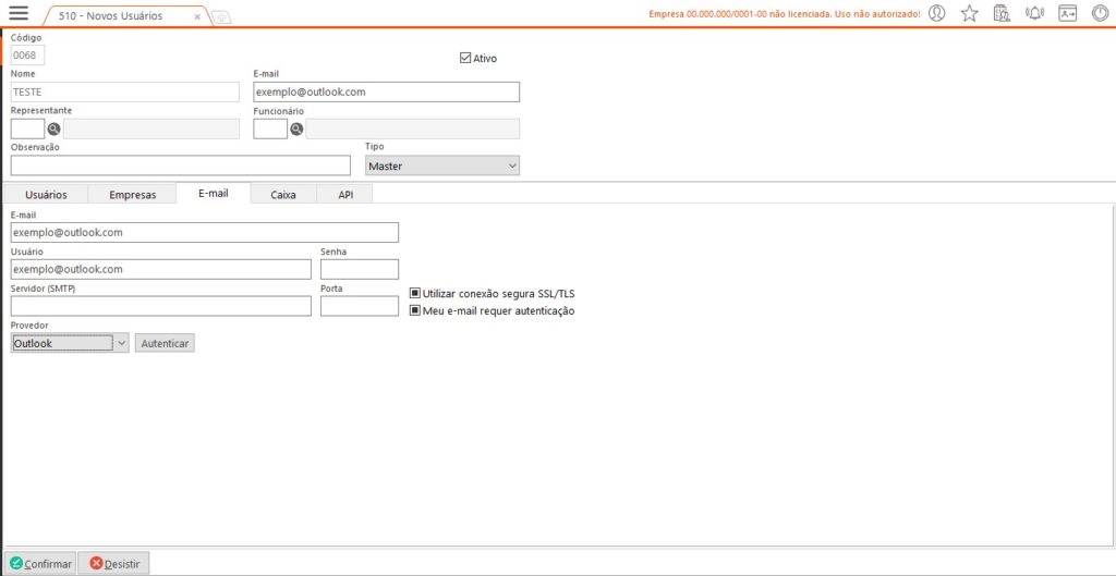 Passo 1 – Clicar no usuário e selecionar o botão “Alterar” no ERP, com isso a tela ficará em modo de edição e deve ser revisado o e-mail nos campos de e-mail e usuário, após isso selecionar o provedor “Outlook” e clicar no botão “Autenticar”: