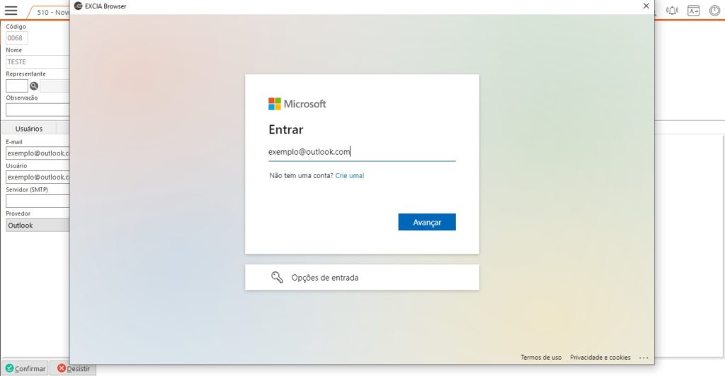 Passo 2 – Excia Browser será aberto, com isso informar o e-mail que será autenticado e após isso a senha (Nesse passo, pode ser solicitado uma autenticação adicional de dois fatores, isso pode variar de acordo com a configuração e-mail):